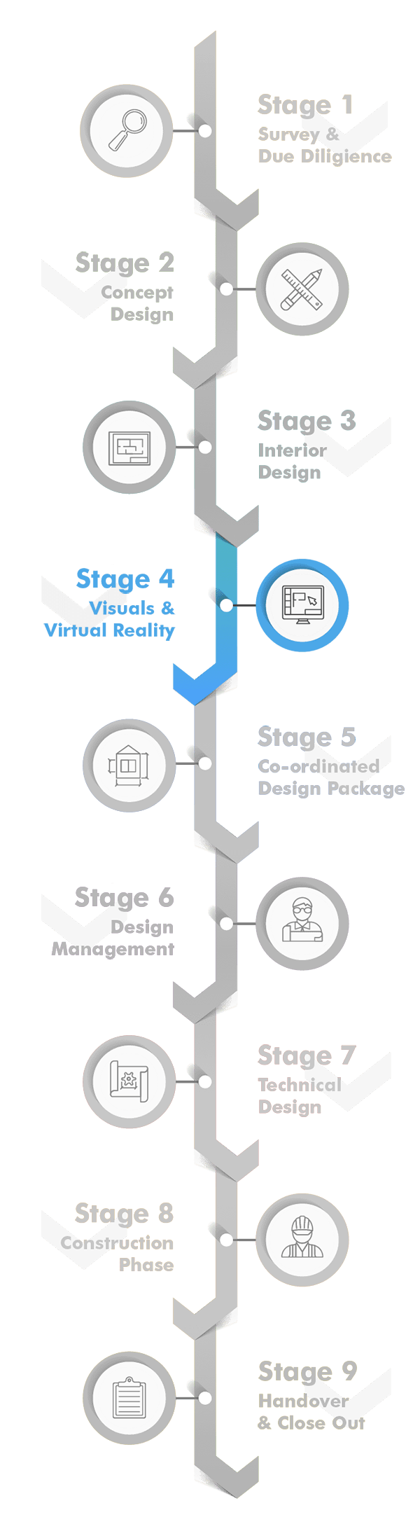 Virtual reality follows a similar process to a static visual often requiring a slightly lesser level of detail, but over a larger area so that any walk through is seamless.